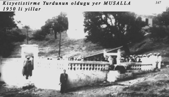 “YIKILAN POSTANE İLE KIZ YETİŞTİRME YURDU ARASINDA ŞEHİTLİK VAR: Peki Recep Kahya’nın mezarı olduğuna kanıt ne olabilir bakın başka bir fotoğrafta bayraklı bir tabut var, musalla taşı, namazgah ve bahriye erleri var. Yani Recep Kahya’nın mezarı bugünkü Kız Yetiştirme Yurdu’nun alt bahçesi ile yıkılan postanenin bulunduğu alan.”