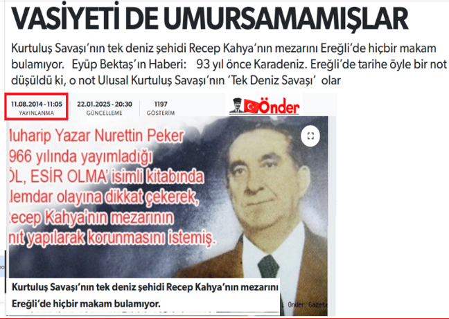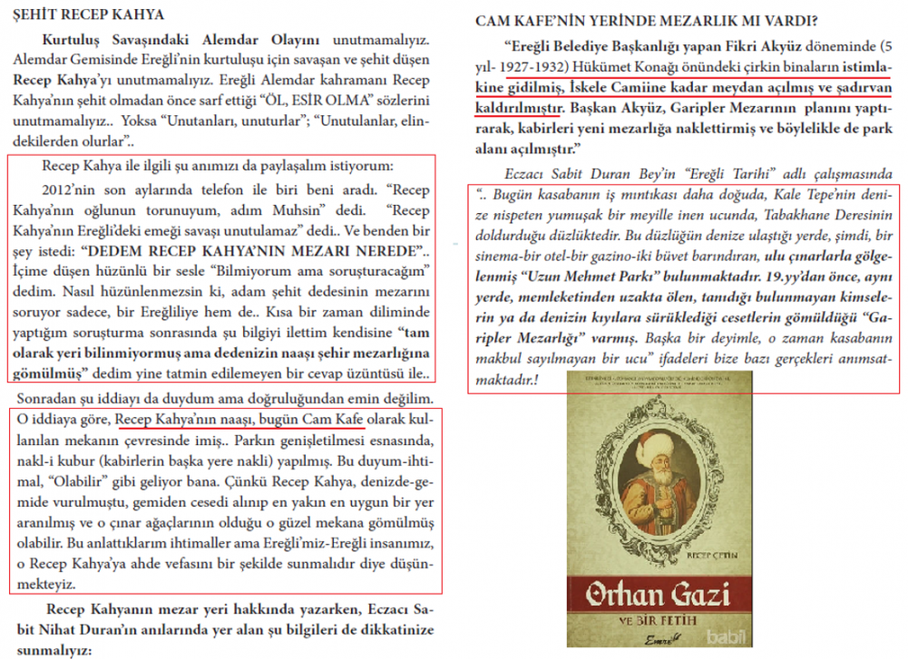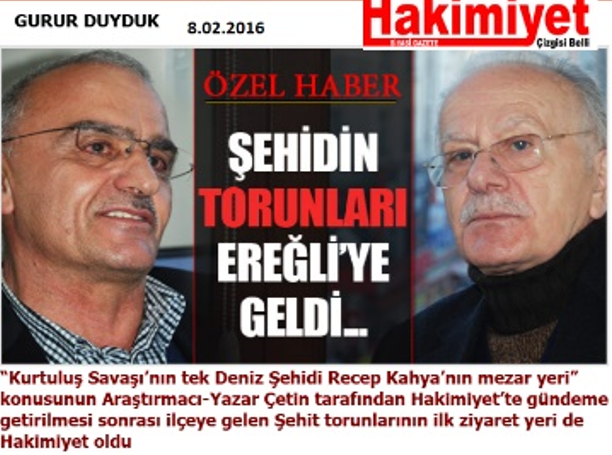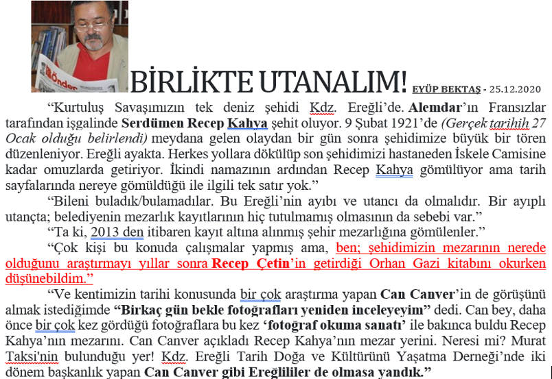 R.ÇETİN: “ALEMDAR GEMİSİ ŞEHİDİ RECEP KAHYA’NIN MEZARI KAYIP”: 2014 yılında yayınlanan kitabımızda ilk defa Alemdar şehidi Recep Kahya’nın mezar yerini sorgulayan kişi olduk. Kitapta bu konuyu dile getirdik. Ve şehidin Rize’deki aile fertlerini bulup (2016) Ereğli’deki törenlere gelmelerini rica ettik. Ve daha sonra şehidin aile fertleri her yıl şehrimize gelmeye devam ettiler.