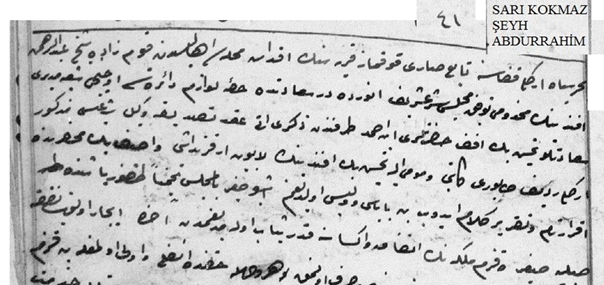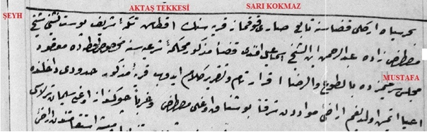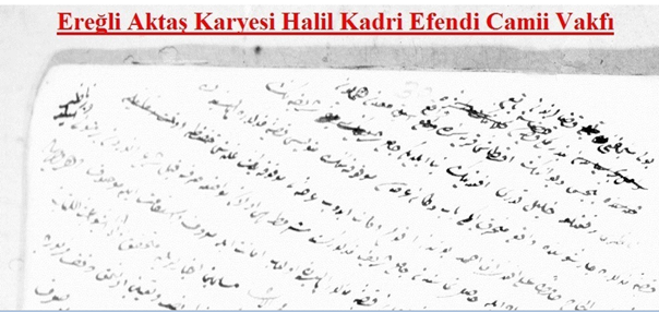 Yukarıdaki belgeye göre, “Bahri siyah EREĞLİ Kazasına tabi, SARIKOKMAZ KARYESİNİN, AKTAŞ Tekke-i Şerifi Postnişini ŞEYH MUSTAFA ZADE ABDURRAHMAN BİN ŞEYH İSMAİL EFENDİ…” şeklinde devam eden bilgiler bulunmaktadır.