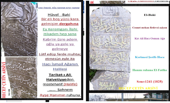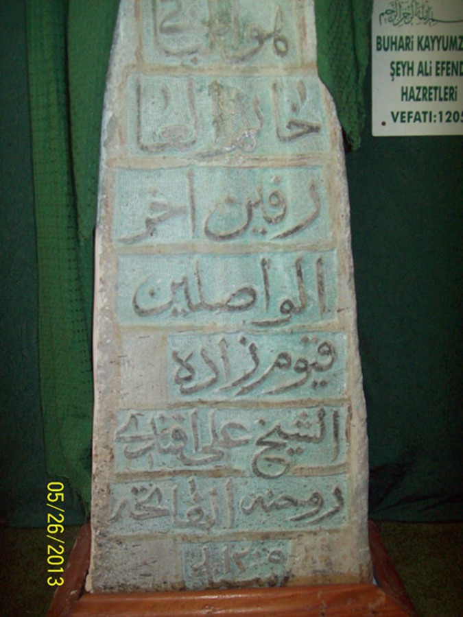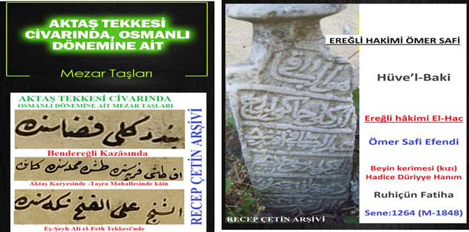 Yukarıdaki aynı ifadeleri tekrar edersek, “Şeyh Kayyumzade Ali Efendi şikayet üzerine, Ereğli kadısının huzuruna davet edilir. Gayet güzel karşılanır kendisine ikramda bulunulur. Kadı, size ibadetlerinizi yapabilmeniz ve bir dergah kurmanız için bir yer verelim, beğendiğiniz bir yer varsa söyleyiniz, der” sözünü okuyunca, bizim dikkatimizi çeken bir husus oldu. Türbenin avlusundaki mezar taşlarını okurken, bir taşta şu ifadeleri tespit ettik: