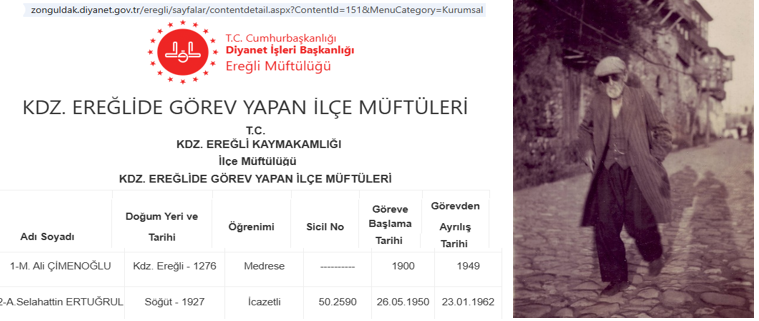 Sezai Bey bize “EREĞLİ’NİN İLK MÜFTÜSÜ DEDEM” dediğinde ama bu olamaz ki diye refleks verdim. Çünkü tarih boyunca KAZA hüviyeti olan EREĞLİ’nin tarihi belgelerini incelediğimizde Osmanlı dönemi boyunca çok sayıda Müftü ismi zikredildiğini belgeler üzerinden görmüştüm” dedim. Sonra yaptığım kısa bir araştırmada bu şifahi bilgilerin de (Zonguldak Diyanet) internet sitesinde bulunduğunu tespit ettim. Orada da gördüm ki EREĞLİ MÜFTÜLERİ listesi tespit edilmeye başlandığında 1900 yılı esas alınarak listenin başlatıldığını gördüm. Bu arada Rıdvan Çimenoğlu ile yapılmış bir röportajda vermiş olduğu şu cevabı da ekleyelim: “1925 yılında Ereğli’de doğdum. Esas 1341 Hicri. Futbol sahasının yanında Beyçayırı’nda evimiz vardı. Orada doğdum büyüdüm. O zamanlar oralarda çok ev yok. Bizimkinden başka Mehmet Bey’lerin evi vardı en dipte. Bizim evin yanında MEDRESE vardı. Çınar ağaçları vardı. Babam Mehmet Çimenoğlu ABDİ Köyü’nden. ‘Ben mektebe gideceğim.’ demiş. İstanbul’da Saray’da memur olarak çalışan akrabalarımızın yanına gitmiş ve Sultanahmet’teki Medrese’de okumuş, mezun olmuş. O dönemde Ereğli Müftüsü vefat etmiş sanırım. O sebeple babamı Ereğli’ye Müftü olarak atamışlar. Merkezde yazıhanesi vardı. Annemin adı Hatice. O da Ereğli’li. Orhanlar mahallesinden. Ağabeylerim vardı; Suat ve Nuri Çimenoğlu. Hatice isimli de bir ablam vardı.”…