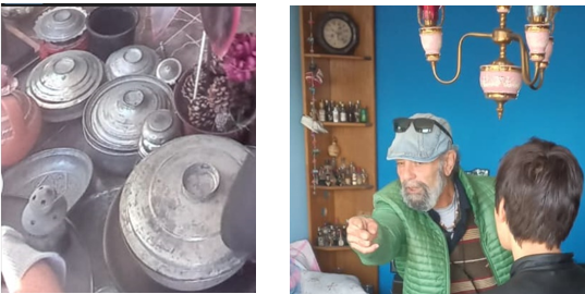 Sezai Çimenoğlu’nun mekanında da adeta kültür müzesi hüviyeti gördük. Mekanda yok yok. Mesela tencereler tavalar tabaklar daha onlarca geçmişe ait ev araç gereçleri gördük ki her biri ayrı bir konu anlatımı gerekecektir. Bu konuda ayrı bir çalışma yapmamız zorunluluğu doğduğunu da buradan belirtelim.